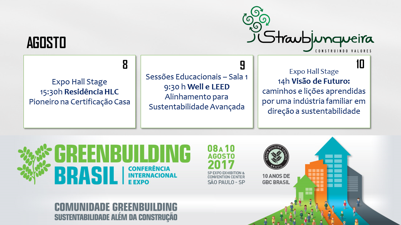 De 8 a 10 de AGOSTO, a StraubJunqueira estará disseminando seu conhecimento na GBC Brasil – Conferência Internacional e Expo 2017! Veja nossa programação: –