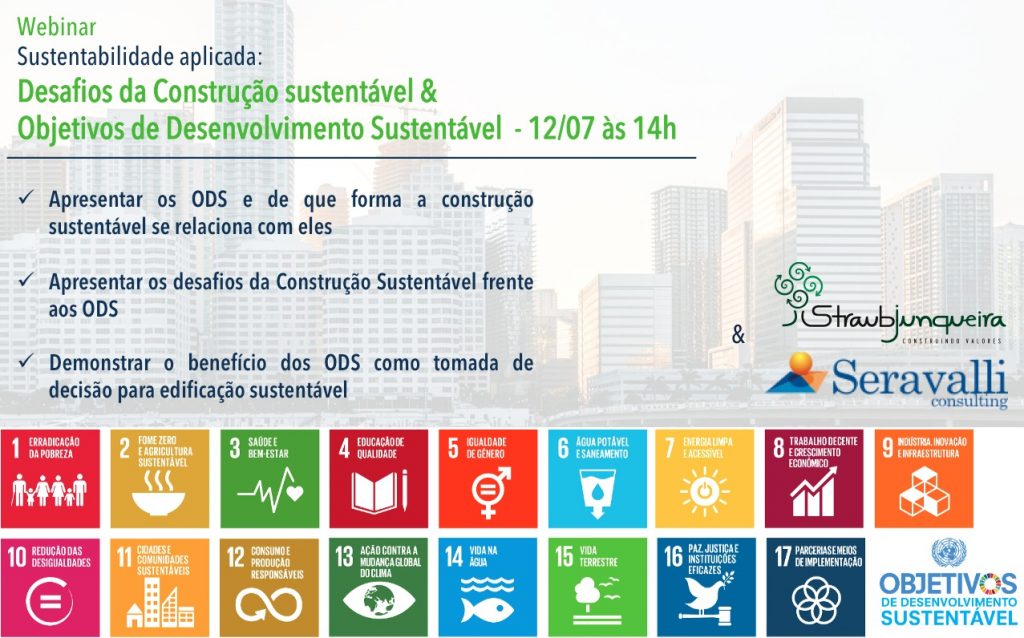 Dando continuidade a série de webinars , no dia 12/07, às 14h, a StraubJunqueira em parceria com a Seravalli Consulting, irão promover a palestra online gratuita sobre Desafios da Construção Sustentável & Objetivos de Desenvolvimento Sustentável